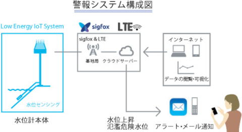 - IoTを駆使し24時間メールにより危険水位警報を自動発信。
